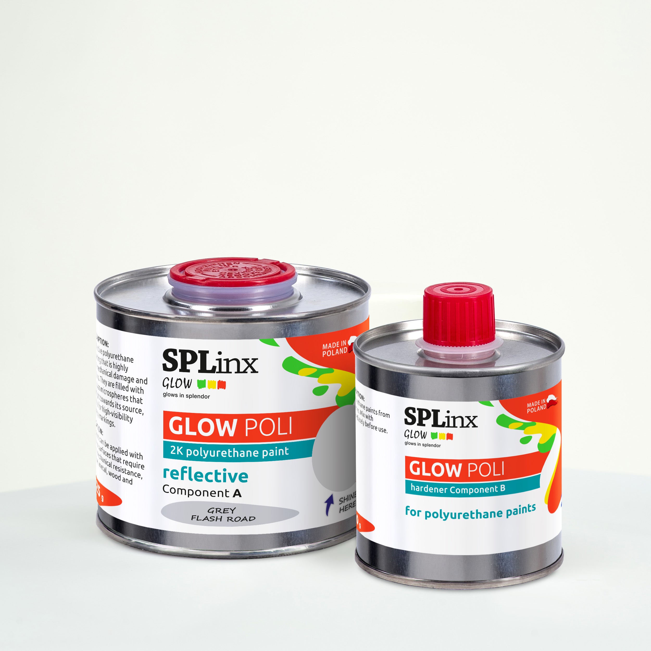 The reflective polyurethane paints GLOW POLI are used in construction, industry, forestry, and the design of commercial spaces. The use of light-reflecting paint helps increase safety on roads, parking areas, production halls, and warehouses. You can also use the paint for DIY projects, especially for creating striking reflective decorations.